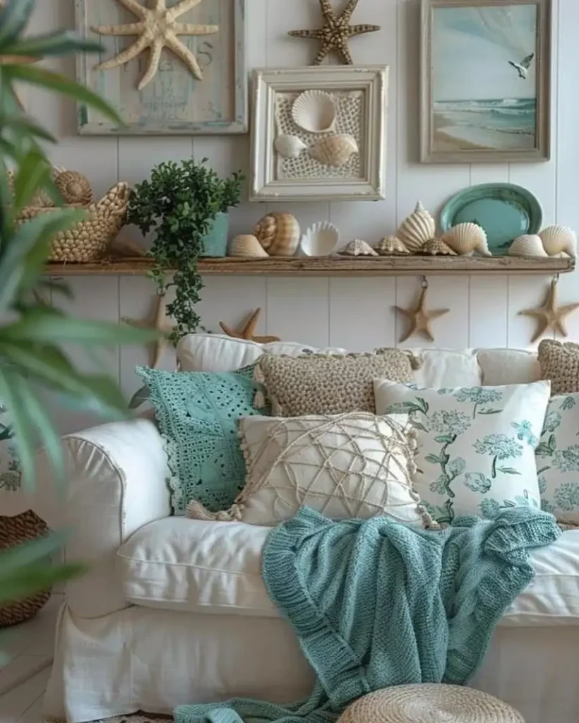 این یکی کامل میره سمت انرژی کلبهی ساحلی: صدفها، ستارههای دریایی، تابلوهای لایهلایه و همهچی. اما به جای اینکه کیچ و مصنوعی بشه، گرم و نوستالژیک از آب دراومده؛ مثل یک خانهی تابستونی که سالها دوست داشته شده.