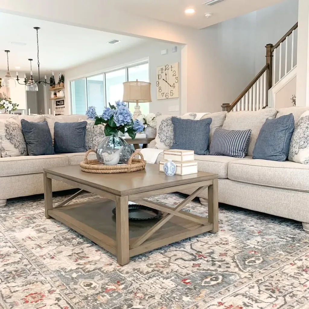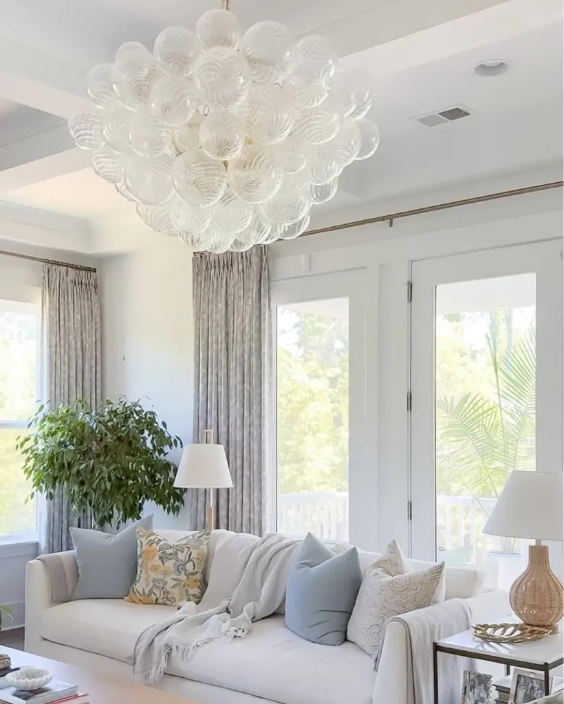 این پذیرایی همپتونز رو زمزمه میکنه، نه اینکه داد بزنه. سفیدهای نرم، آبیهای روشن، و یک مقدار بافتِ گرم، فضا رو شیک میکنه ولی همچنان راحت میمونه.