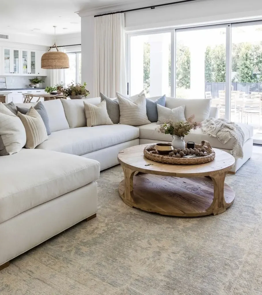 یک مبل بزرگ راحت کنار عناصر ارگانیک، فضا رو ریلکس و زمینی نگه میداره. این همون سبک ساحلیه که «راحتی» رو اولویت میذاره؛ برای حرفهای طولانی و بعدازظهرهایی که پاها رو میذاری بالا.