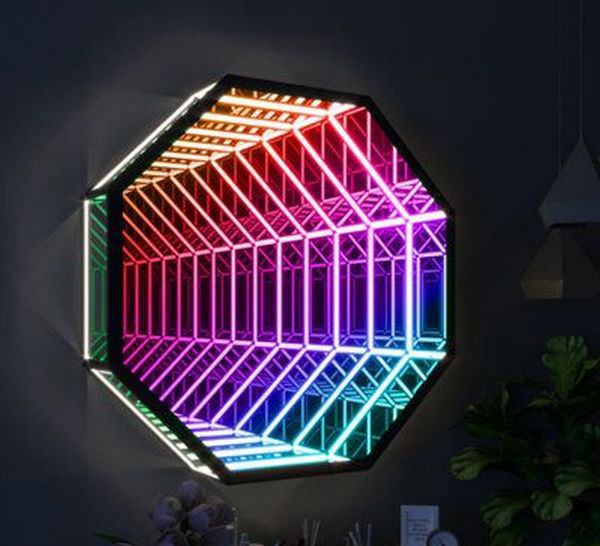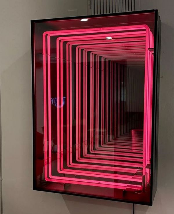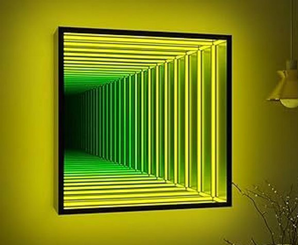 آینه بینهایت به عنوان تابلو دیواری: میتوانید یک آینه بینهایت را به صورت یک تابلو دیواری در دکوراسیون اتاق نصب کنید. این تابلو آینه میتواند تمرکز اصلی دکور اتاق شما باشد و تأثیر زیبایی و عمق را به فضا اضافه کند.