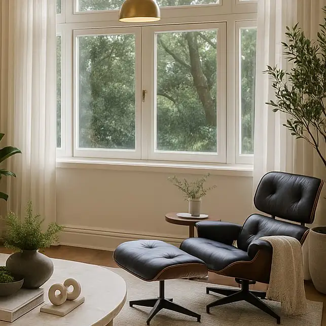 یک حس سینماییِ بیسروصدا توی این فضا هست: دو صندلی ایمز کنار هم، مثل دو دوست قدیمی وسط مکالمه، اما با تضاد شیک: یکی سفید کرمی، یکی مشکی کلاسیک. انگار «یین و یانگ» با چرم و گردو. فضای اطراف هم خطهای تمیز، نور طبیعی و کمترین شلوغی ممکنه.
