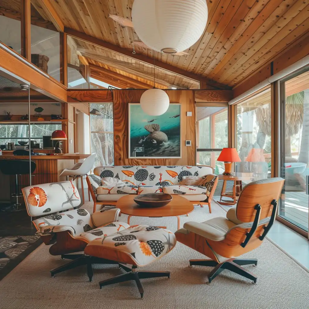 اینجا وقتی حالوهوای میانهقرن قراره برای یک مراسم بزرگ لباس بپوشه، نتیجهاش همین میشه. صندلی ایمز که معمولاً مشکی یا کرم و خیلی باوقار دیده میشه، این بار با یک چاپ گیاهیِ شلوغ و رنگی بازطراحی شده؛ انگار یک مهمونی باغیِ مدرن با رنگهای پُرجرأت.