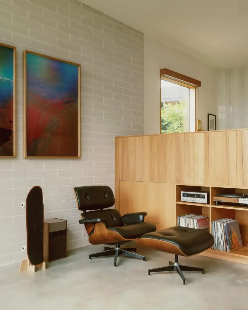 این اتاق برای کسیه که صفحهگرامافون داره چون واقعاً صداش رو دوست داره، نه چون مد شده. کسی که وسایل خاص جمع میکنه چون عاشقشونه. صندلی ایمز اینجا نو و دستنخورده نیست؛ «قصهدار»ه. چرم، درست همونقدر استفاده شده که دوستداشتنی بشه؛ چوب هم پتینه گرفته و پتو نشان میده ساعتهای طولانی اینجا گذشته.