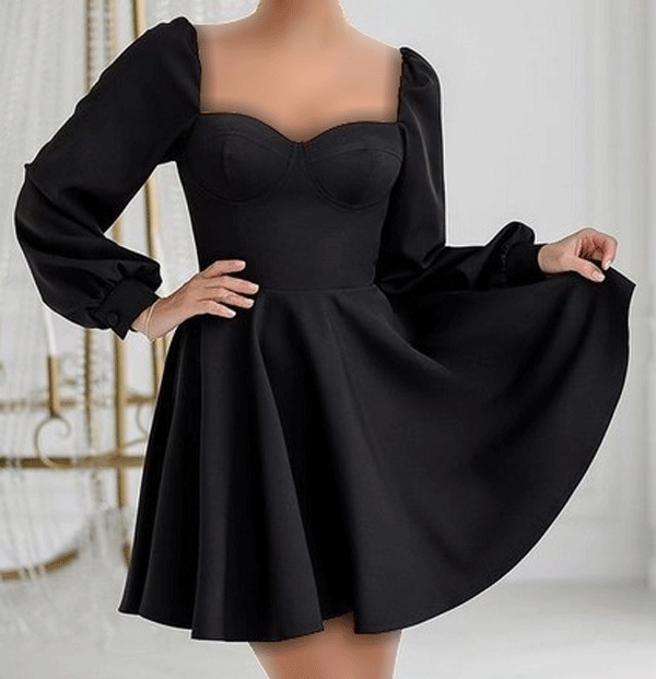 لباس مجلسی با یقه دلبری کوتاه و آستین بلند: این نوع لباس مجلسی با یقه دلبری کوتاه و آستین بلند طراحی میشود تا به شکل و تناسب بیشتری ببخشد. یقه دلبری کوتاه به گردن و صورت زن ظاهری زیبا و جذاب میبخشد و با آستینهای بلند، لباس شیک و امضا قابل توجهی را ایجاد میکند. این لباسها ممکن است با جزئیات تزئینی مانند جواهرات، دانتل یا طرحهای برجسته طراحی شوند.