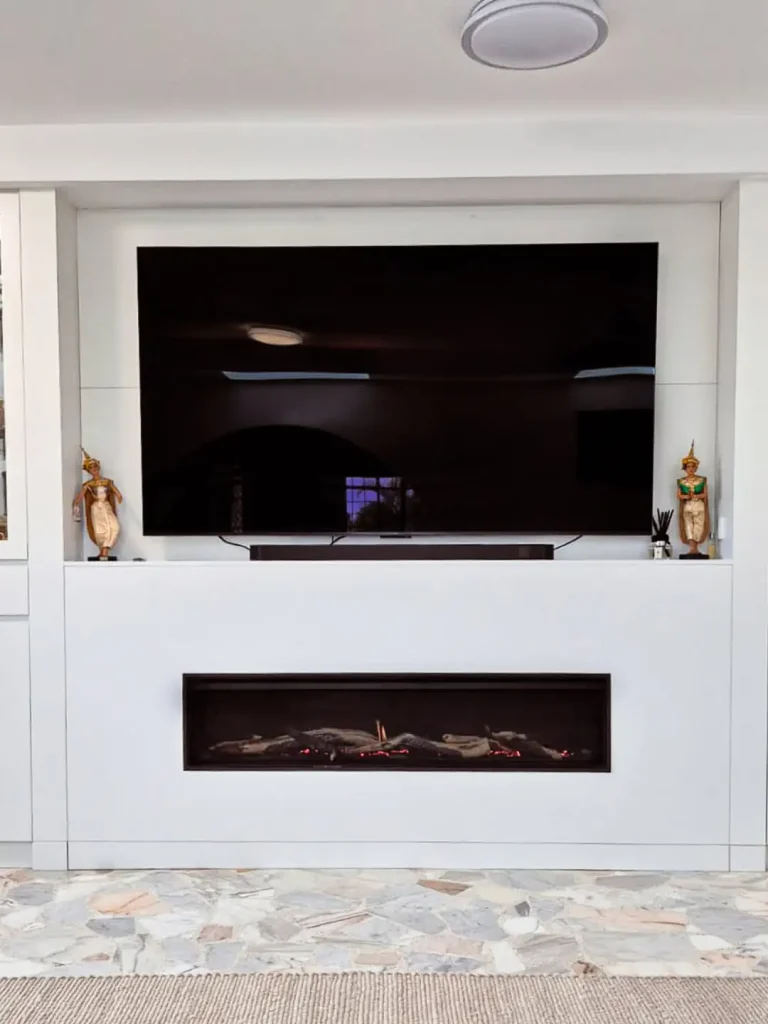اینجا یک نمایشِ دقیق از مینیمالیسمه: دیوار سفید یکدست، شعلهی کشیده و خطی، و صفحهی مشکی بالای آن که مثل یک قاب قدرتمند میایسته. با اینکه کاملاً امروزیه، گرمای آتش باعث میشه فضا صمیمیتش رو از دست نده.