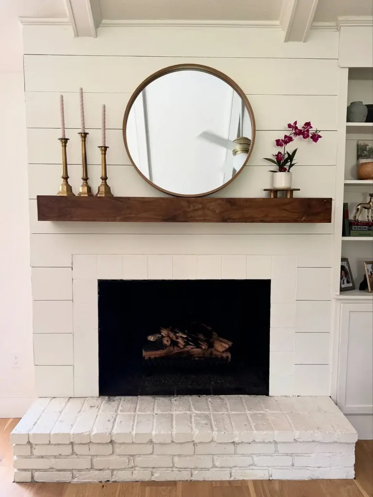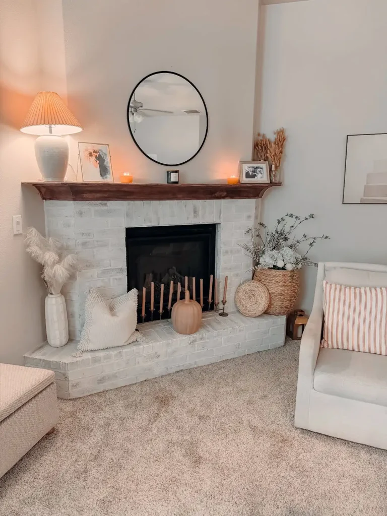 همهچیز در این شومینهی تختهکوبیشده حسابشدهست. آجرهای سفیدِ مات بافت میدن بدون شلوغی، طاقچهی چوبی شناور تضاد میسازه، آینهی گرد دقیقاً مرکز توجهه و شمعدانهای برنجی باریک، قد و برق ملایم اضافه میکنن.