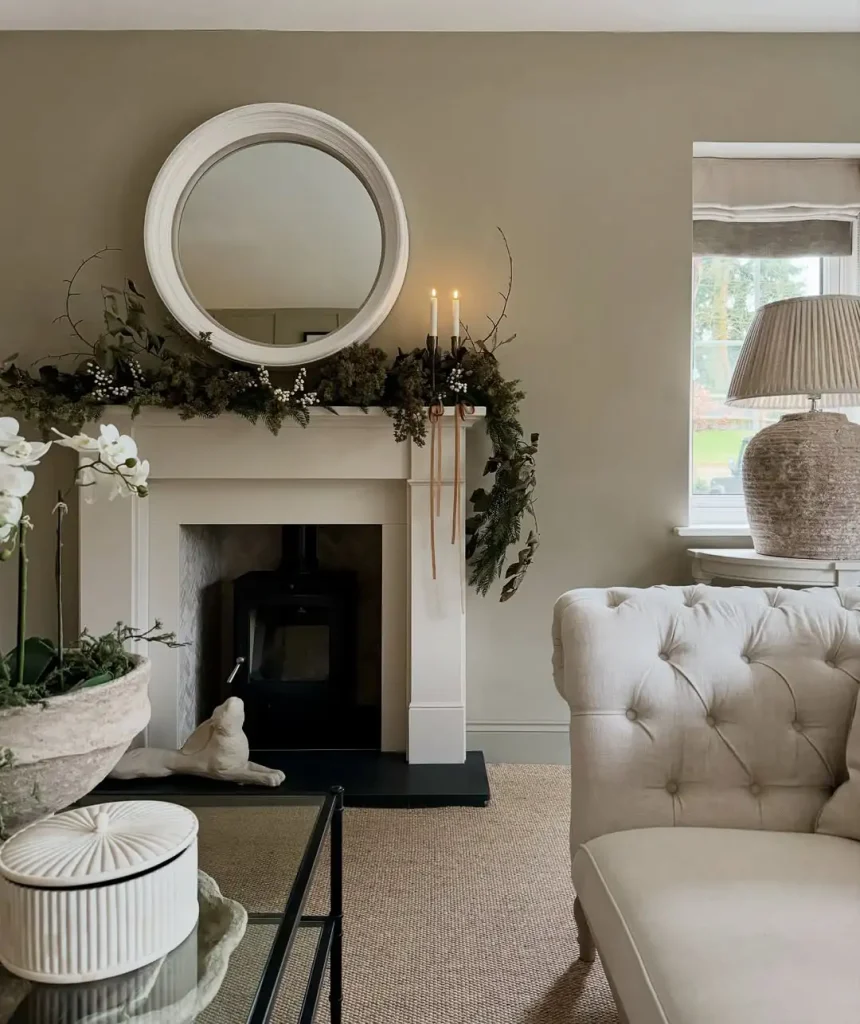 دکور کمحجم و عمودی. آینهی گرد یا تابلو باریک، شمعدانهای کشیده، و یک سبد کوچک کنار شومینه عالیه. شلوغی فقط کوچیکترش نشون میده.