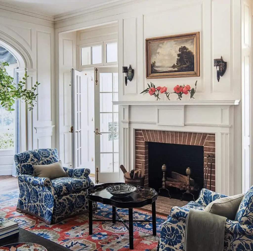قاببندی سفید و رسمیِ دور شومینه، مثل ستونِ معماریِ اتاق عمل میکنه. آجر داخل شومینه بافت و گرما میده و تابلوی منظرهی قدیمی بالای آن یک حس میراث و اصالت میاره. صندلیهای طرحدار آبی، فرش رنگی و گلها هم شخصیت رو وارد قاب میکنن.