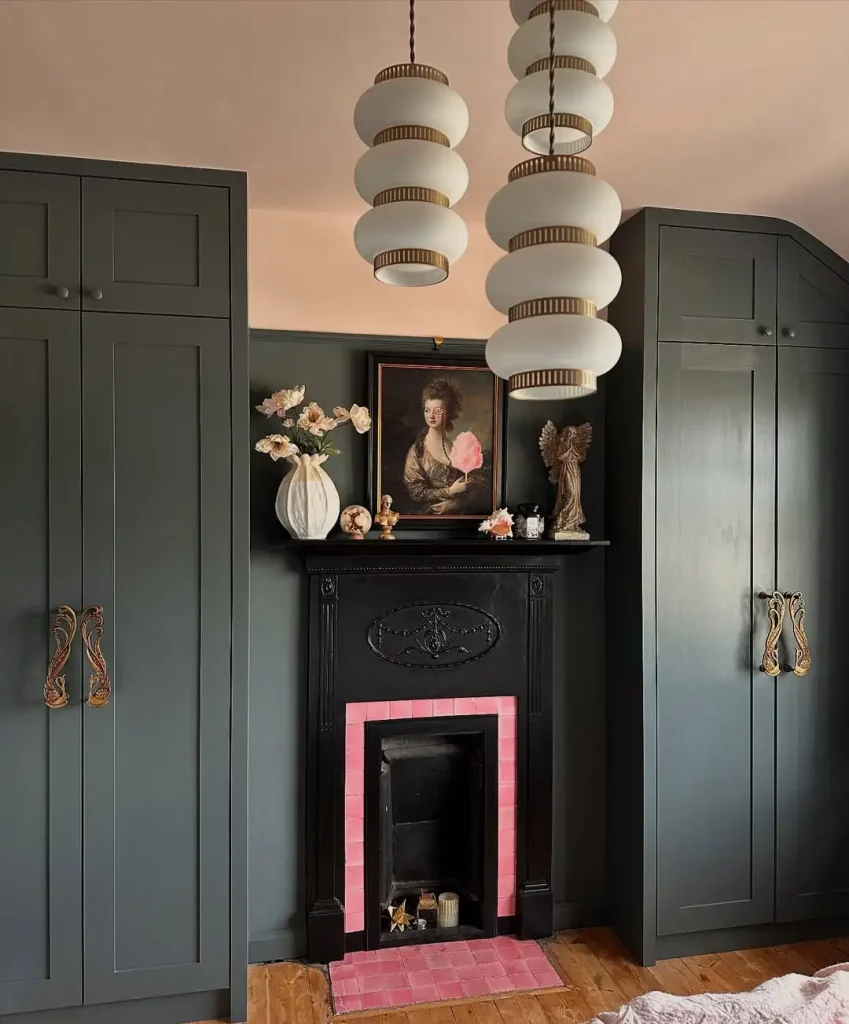 این شومینه یک تضاد سینمایی داره؛ تیره، جسور و خیلی خاص. کابینتهای تیره فضا رو دربر میگیرن، طاقچهی مشکی با کاشی صورتی قاب شده و عمداً قوانین معمول رو به هم میزنه. پرترهی قدیمی و اکسسوریهای مجسمهای هم درام میدن، در حالی که چراغهای آویز مدرن، فضا رو امروزی نگه میدارن.