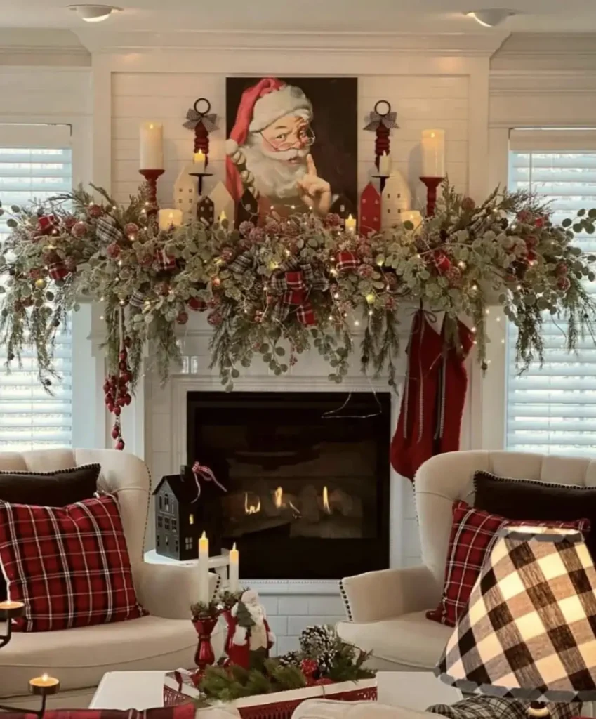 اینجا همهچیز فریاد نمیزنه، ولی قطعاً جشن رو جدی گرفته! قرمز، سبز و طلایی کنار هم، شومینه رو تبدیل به مرکز قصه میکنن. ریسهها با توت و پاپیون سرازیر شدن، و پرترهی بابانوئل بالای طاقچه، یک نوستالژیِ شیرین میاره وسط. چهارخونهها، شمعها و نور گرم هم حس باهمبودن رو تکمیل میکنن.