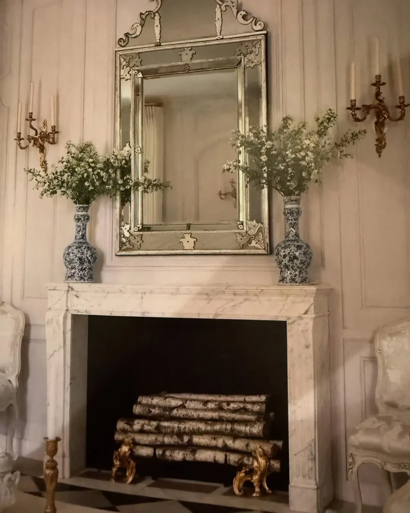 این شومینهی مرمری واقعاً کلاسِ رمانتیکه. آینهی طلاییِ پرکار، رگههای مرمر، و چیدمان شمعها و شاخههای قرمزِ زمستونی، یه قاب شاعرانه ساخته که انگار از توی یک نقاشی قدیمی بیرون اومده. کل فضا یه درام ملایم داره، نه تند و شلوغ.