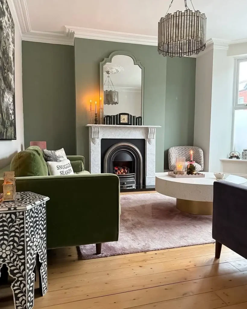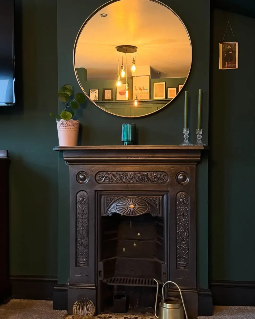 این اتاق سبز تیره، یه وقار خاص داره که آدم دلش میخواد بیشتر توش بمونه. شومینهی چدنیِ پرنقش زیر آینهی طلایی گرد، مثل یک اثر تاریخی میدرخشه. دیوارهای سبز زمردی فضا رو دربر میگیرن و شمعها و سبزینهی کم، ریتم آرومی به این عمق میدن.