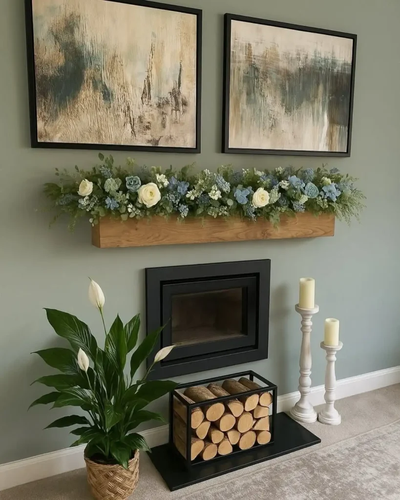 این شومینه مثل یک نفس تازهست. دیوار سبز روشن پسزمینهی آروم میده، قاب مشکیِ داخل شومینه تمیز و مدرنه، طاقچهی بلوطی گرما میآره، و ریسهی گلهای آبی و سفید همه چیز رو لطیفتر میکنه. دو تابلو آبستره هم رنگها رو تکرار میکنن تا قاب یکپارچه بشه. شمعها و سبد هیزم هم بافت میدن بدون شلوغی.