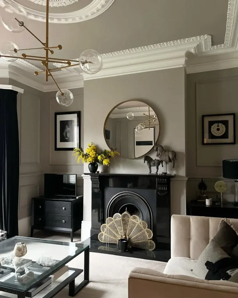 اینجا شکوه، آروم حرف میزنه. طاقچهی مشکی براق مثل آینه نور رو منعکس میکنه، لوستر مجسمهای بالا هم درخشش اضافه میکنه. آینهی گرد طلایی فضا رو گرمتر میکنه و شاخههای زرد و فیگورهای قدیمی، شخصیت وارد قاب میکنن. ترکیب خنثیهای نرم با فلزات درخشان، یک درام کنترلشده میسازه.