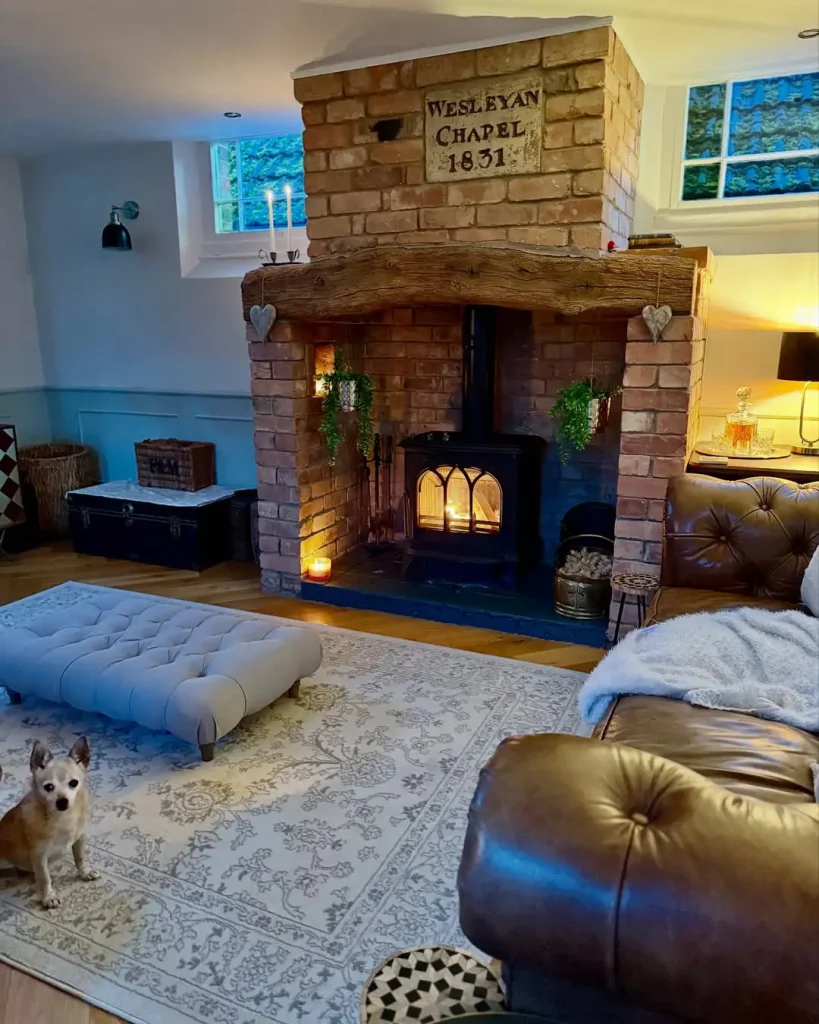 این شومینه واقعاً تاریخ داره. آجرِ دستی و تیر چوبیِ قدیمی فوراً نگاه رو میگیرن. تابلوی حکاکیشده بالا هم به فضا روح میده. گرمای بخاری هیزمی هم اون حس «راحتی واقعی» رو میسازه. جزئیات کوچیک مثل پاف لمسهدوزی، صندوق قدیمی و حتی حضور سگ کنار آتش، قصه رو کامل میکنه.