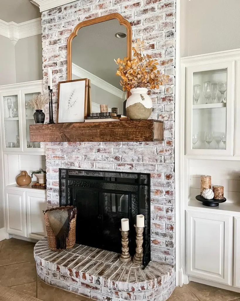 آجر شومینه با سفیدکاری ملایم، بافت رو نگه داشته ولی سنگینش نکرده. طاقچهی چوبی و کف قوسیشکل شومینه هم عمق میدن. گلدانهای کهربایی و شاخههای خشک، رنگهای خاکی رو زنده میکنن و آینهی طلایی همه چیز رو جمع میکنه.