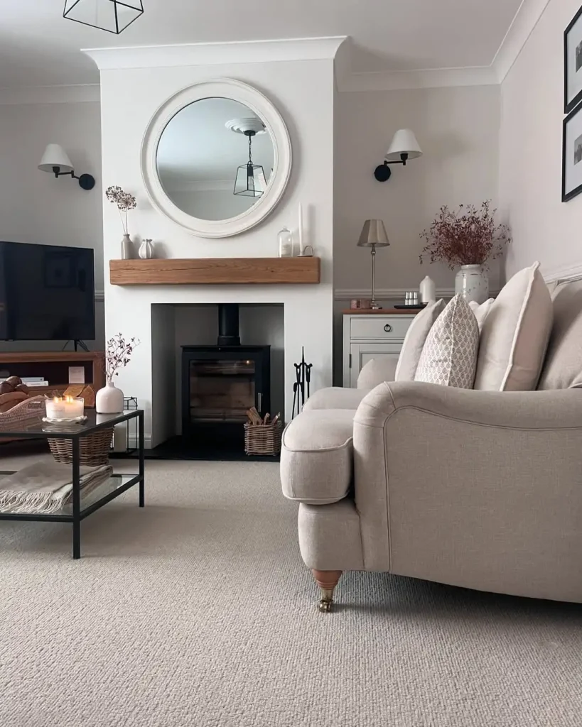 همهچیز توی این اتاق هدفمند و آرومه. پالت کرمی و چوبی، یک حس تمیزی و هماهنگی میده. آینهی گرد مرکز توجهه و بازتاب آرامش فضا رو بیشتر میکنه. طاقچهی بلوطی و بخاری مدرن هم گرما و وزن بصری میدن، بدون اینکه فضا سنگین بشه. یک گلدان گل خشک هم دقیقاً به اندازه، بافت و انسانیت اضافه میکنه.