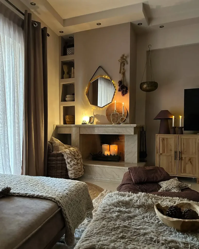 این تصویر انگار قصهی شبهای کنار آتیشه؛ آرام، گرم و واقعی. اگر بخوای همین حس رو بسازی، روی بافتها تمرکز کن: کتان، حصیر، چوب بازیافتی… نتیجه میشه یه گرمای صمیمی که همیشگیه و توی زندگی واقعی اذیتت نمیکنه.