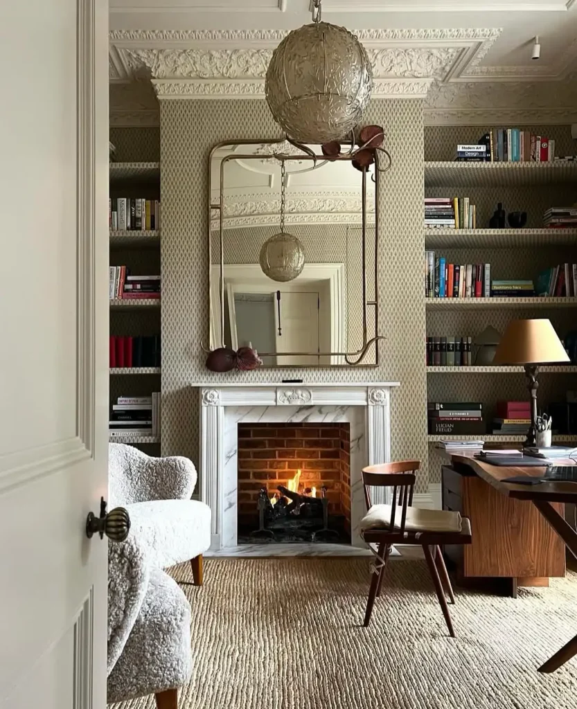 این شومینهی مرمری مثل مرکز فرماندهیِ زیباییه. رگههای مرمر نرم و شیکه، آجر داخل شومینه بهش بافت میده، کاغذدیواری پشتش هم لایهی بصری اضافه میکنه. آینهی مجسمهای بالای آن جزئیات سقف رو بازتاب میده و کتابخانههای دو طرف، تقارن و تعادل میسازن.