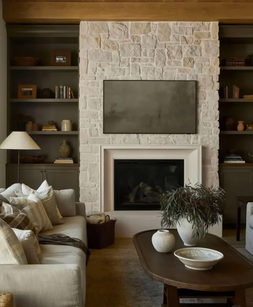 این شومینهی سنگی مینیمال ثابت میکنه آرامش میتونه خیلی هم چشمگیر باشه. نمای سنگ آهکی با اختلافرنگهای خیلی ظریف، نور رو قشنگ میگیره و یه گرادیان طبیعی از گرمی و خنکی میسازه. خطهای معماری تمیز با بافت طبیعی سنگ ترکیب شده و نتیجهاش اینه که شومینه «قوی» دیده میشه، بدون اینکه زور بزنه.
