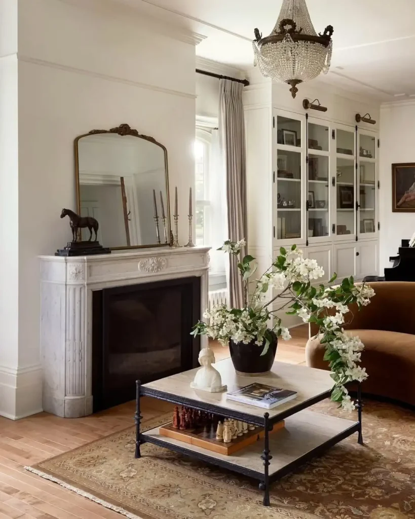 این شومینهی مرمری، یه ادای احترام به زندگی شیک و آرامه. آینهی پرکار زیر لوستر کریستالی میدرخشه و گلهای سفید روی میز پایین، یه نفس تازه به پالت آروم فضا میده. همهچیز انگار حسابشدهست اما زورکی نیست؛ حسش اینه که این زیبایی با گذر زمان شکل گرفته.