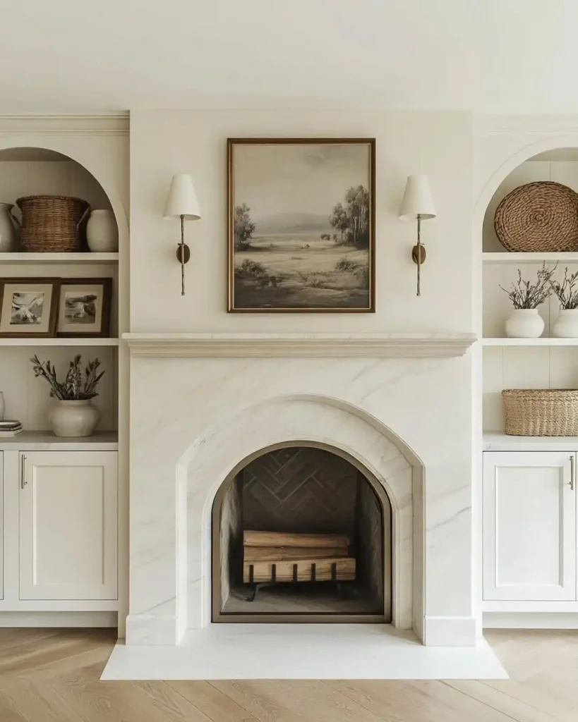 اینجا سادگی خیلی خوشفرم اجرا شده. شومینهی مرمری قوسیشکل مثل یک مجسمهی آرومه؛ مرتب، مینیمال و اطمینانبخش. کابینتهای سفید و قفسههایی که داخلش سبد حصیری و سفال خنثی چیده شده، فضا رو هم «کیوریت» نشون میده هم راحت.