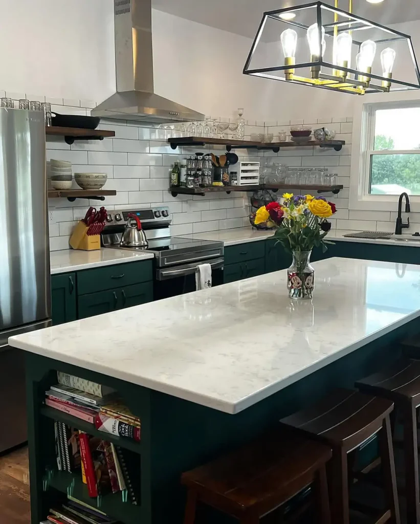 این آشپزخونه پچپچ نمیکنه، صاف حرفش رو میزنه. کابینتهای پایینی سبز یشمی تیره، پایهی محکم و خاصی به فضا دادن، ولی ستارهی اصلی جزیرهایه که مثل یک کتابخونه کوچیک طراحی شده. کتابهای آشپزی روی هم، دستورهای خانوادگی، شاید چند تا لکهی بامزه از خاطرات آشپزی… قبل از اینکه اجاق رو روشن کنی، خودش داستان تعریف میکنه.