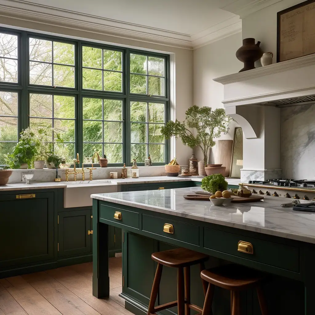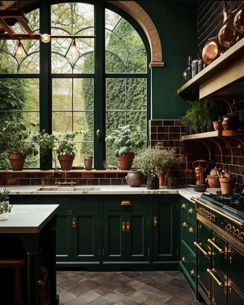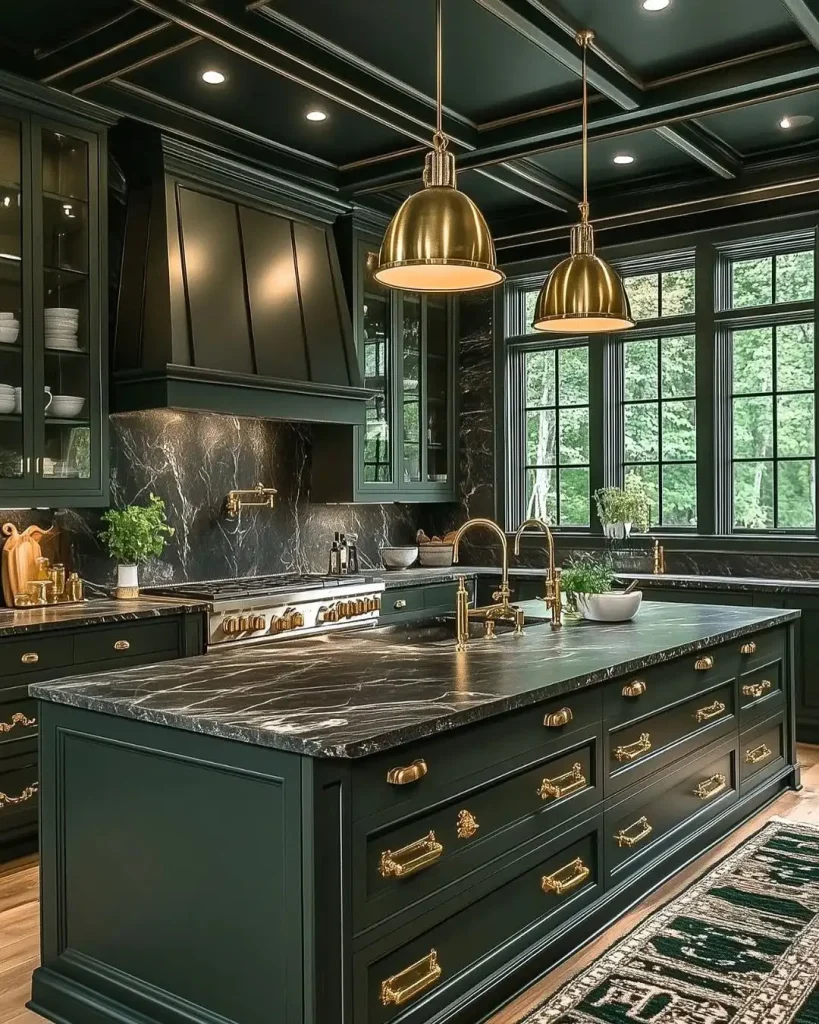تیره، مرموز و جذبکننده. کابینتهای سبز نزدیک به مشکی، کاشیهای برنزی تیره و یک منظره پشت پنجره که انگار توی رمانهای کلاسیک پیدا میشه. قابلمههای مسی و یراق برنجی هم گرما میارن، بدون اینکه فضا بیحال بشه.