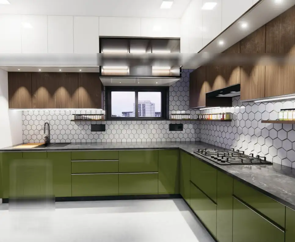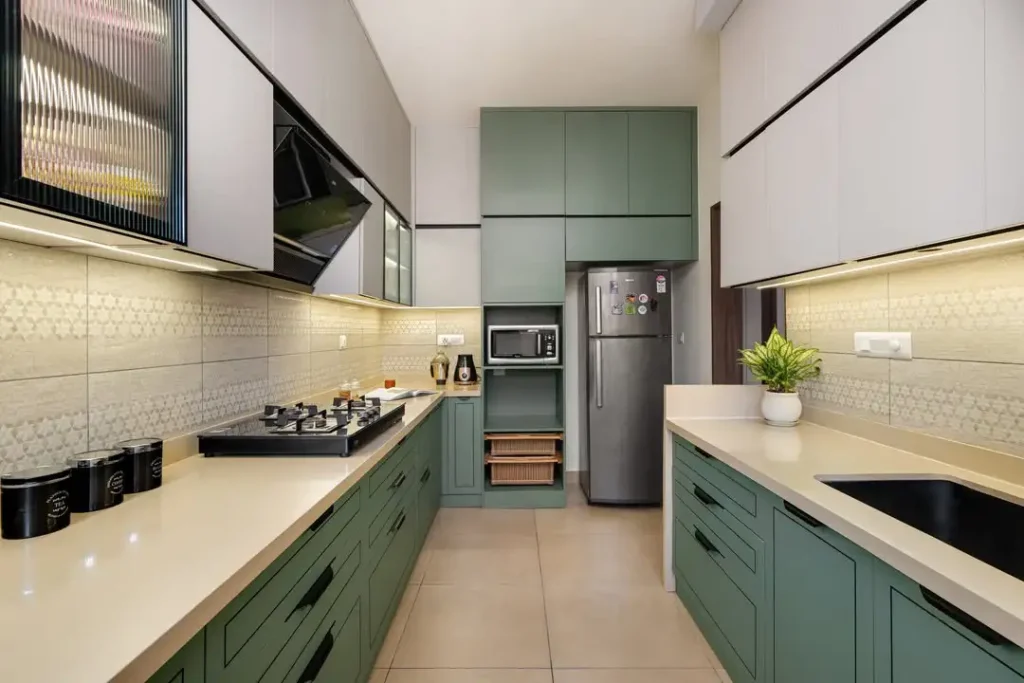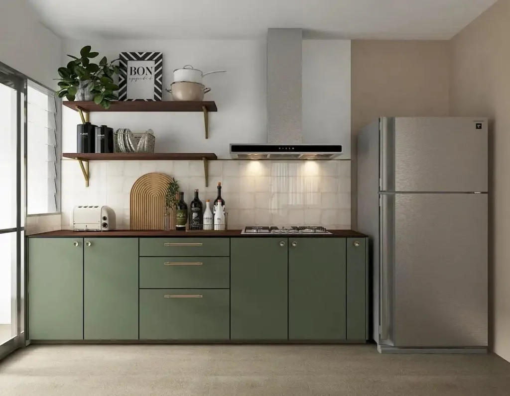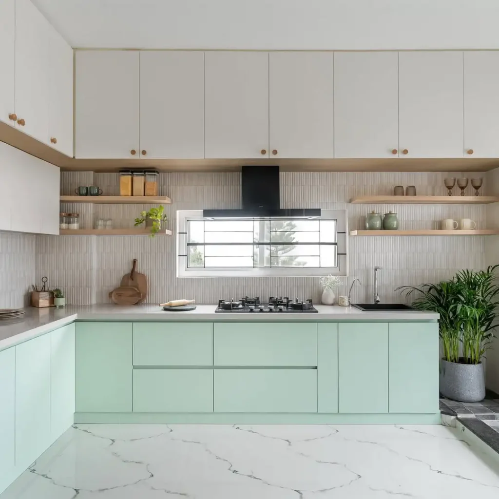 سبزهای روشنتر مثل مریمگلی، نعنایی یا پستهای معمولاً فضا رو بازتر نشون میدن. اگر سبز تیره دوست داری، بهتره با کانتر روشن و نور کافی بالانسش کنی.