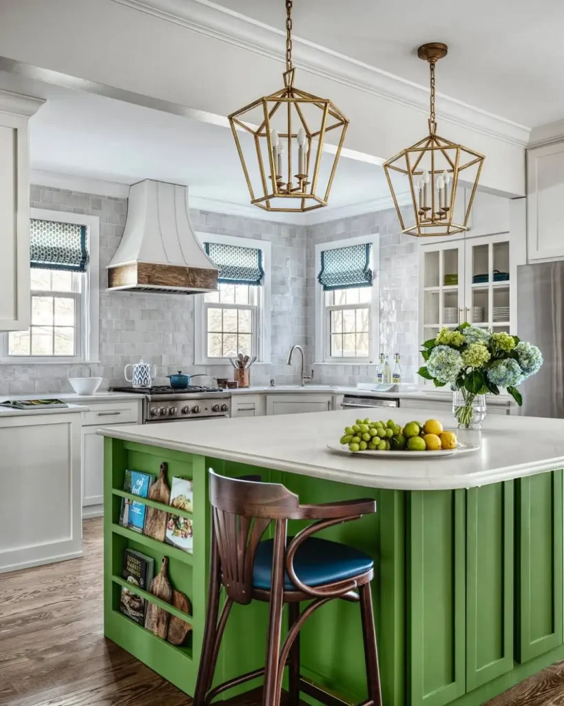 سبز لیمویی، ولی کاملاً طراحانه. جزیره مثل یک قاچ لیموی تازه وسط یک دریای رنگهای خنثی میدرخشه: مرمر، خاکستری روشن، طلایی. چراغهای آویز فانوسی هم همون جذابیت کلاسیک رو میارن، ولی شیک و امروزی.