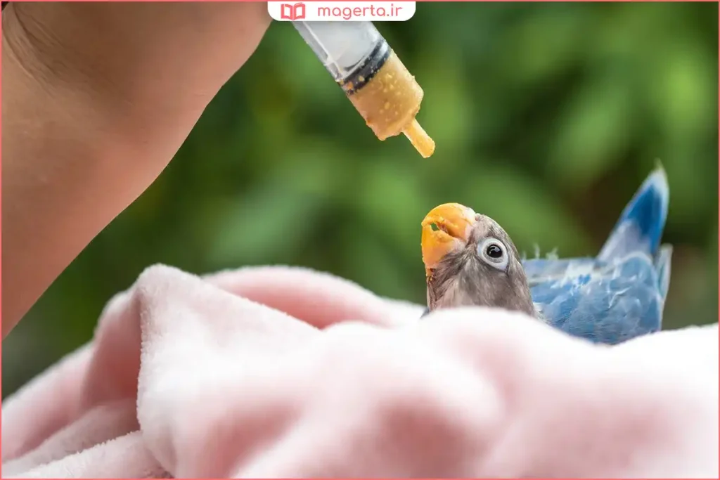 باید از سرلاک مخصوص پرندگان استفاده کنید. تغذیه با سرنگ یا قاشق مخصوص انجام میشود.