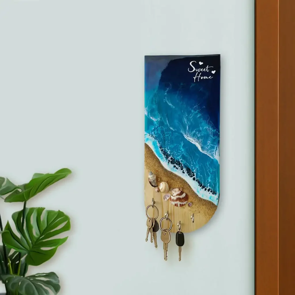 این یکی واقعاً آرامش ساحل رو میاره روی دیوار. هنر رزینی مثل موج دریا از آبی تیره میرسه به شنِ نرم، حتی با صدفهای واقعی. جاکلیدیایه که هم کار راه میاندازه هم خودش دکورِ حسابی محسوب میشه و ناخودآگاه دلت میخواد برنامه سفر بچینی.