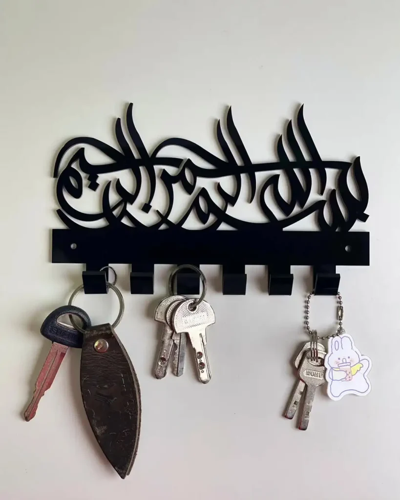 این یکی برای طرفدارهای “اثرگذاری” است. خوشنویسی عربی روی زمینه تیره، بیشتر از جاکلیدی بودن، یک اثر هنریِ کاربردیه. سیلوئت تیره کنار دیوار روشن، حس گالری و دیوارِ هنری میده و در عین حال کاملاً کاربردی میمونه.