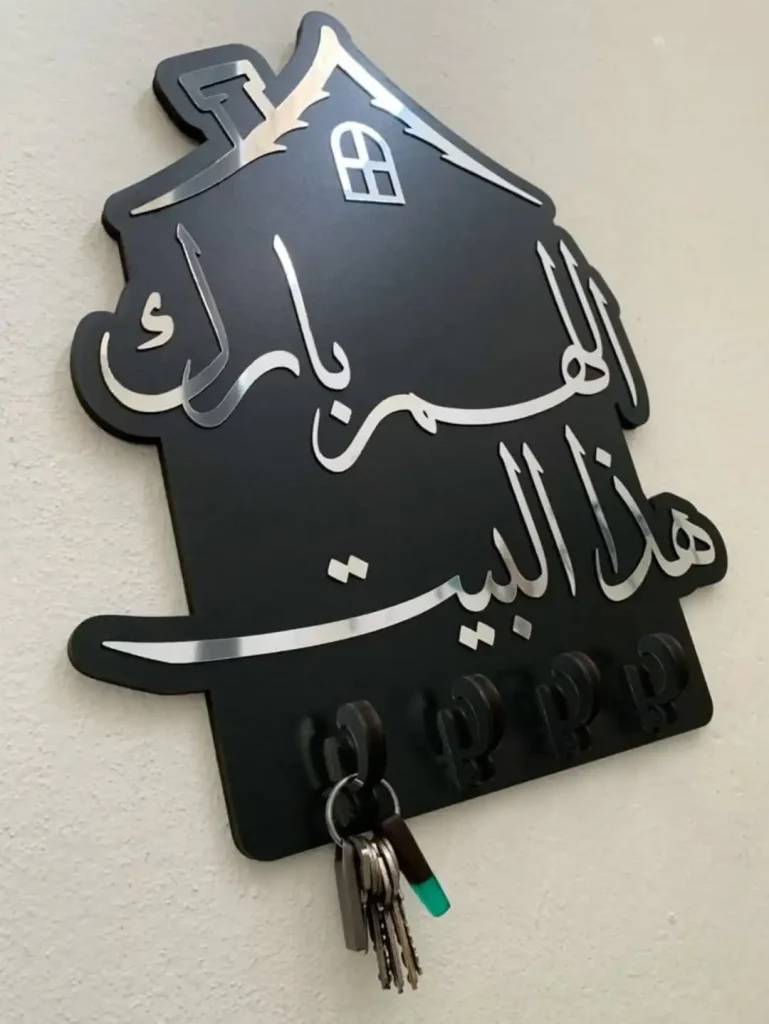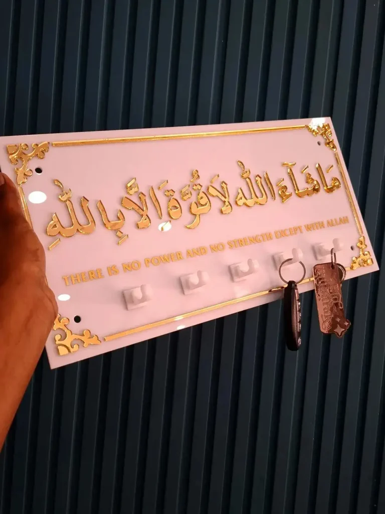 این جاکلیدی پلکسی (اکریلیک) خیلی تمیز، معنوی و شیکه. خوشنویسی طلایی کنار نور سفید ملایم، هم مدرنه هم پرمعنا.
