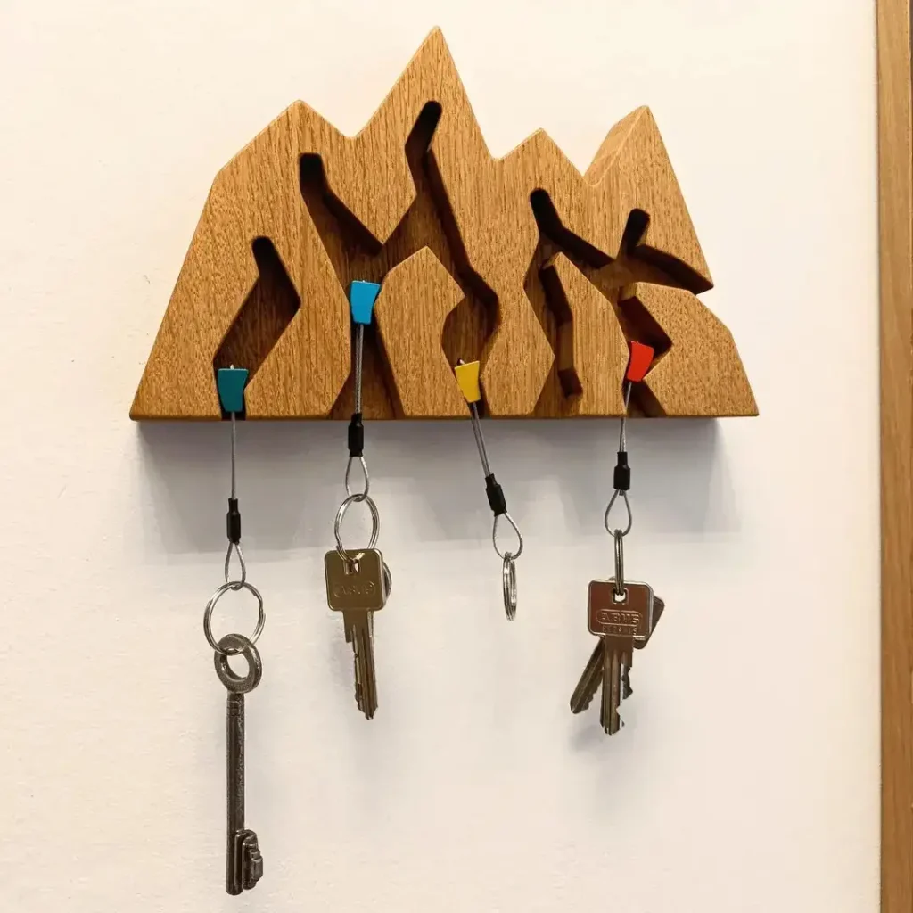 هر کلید مثل یک کوهنورد کوچیک از میخهای رنگی آویزون میشود و بافت چوب هم گرما میدهد به هندسهی تمیز کار. طراحی با یک چشمک، بدون جدی گرفتن بیش از حد خودش.