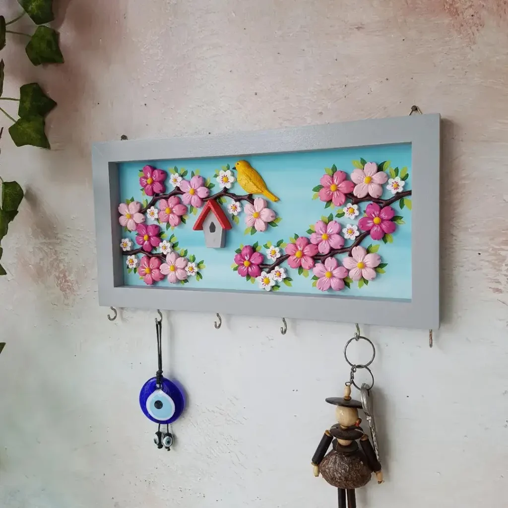 این یکی انگار بهار را میکوبد روی دیوار. شکوفههای صورتی لطیف، یک پرنده کوچولو که بالای یک لانه/خانهی پرنده نشسته، و یک آسمان فیروزهای رویایی… بیشتر شبیه یک باغچه کوچیکه تا جاکلیدی.