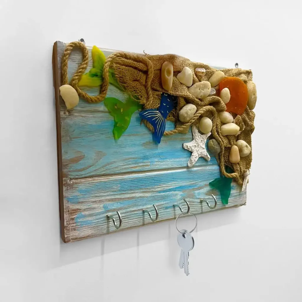 ساحل را واقعاً میآورد توی خانه. پایه چوبیِ رنگپریده با گونی، مرجان مصنوعی، سنگریزه و صدف لایه شده و کلید گذاشتن را تبدیل میکند به یک تجربه لمسیِ ساحلی.