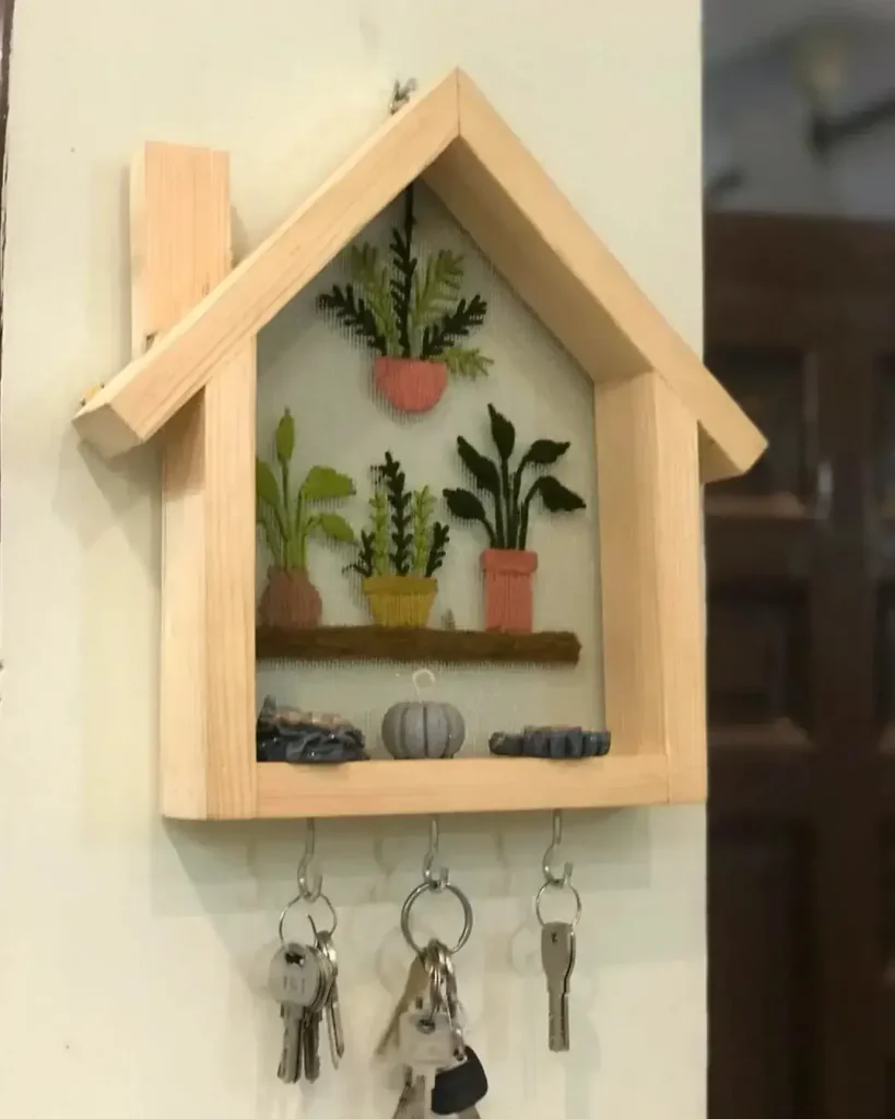 این دیگه خیلی بانمکه! یک قاب خونه کوچیک با سبزیِ گلدوزیشده داخلش… انگار کلیدها یک باغچه کوچولو دارن که توش زندگی میکنن. جذابیت دستسازش دقیقاً همون چیزیه که دل آدم رو گرم میکنه.