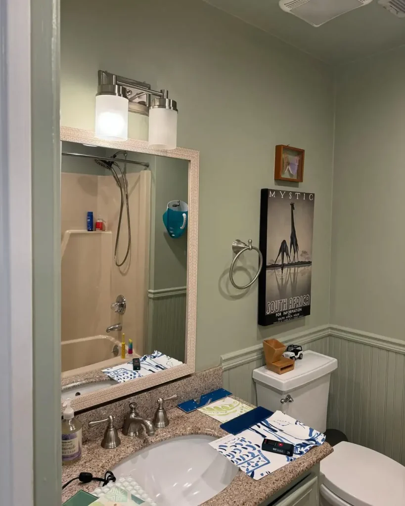 یک دیوار سبز ملایم میتواند کل حمام را آرام کند. پردهی حمام آبی طرحدار هم فقط به اندازهی لازم بازیگوشی دارد. کابینت کرمی و کف گرم هم فضا را خانگی و راحت نگه میدارند.