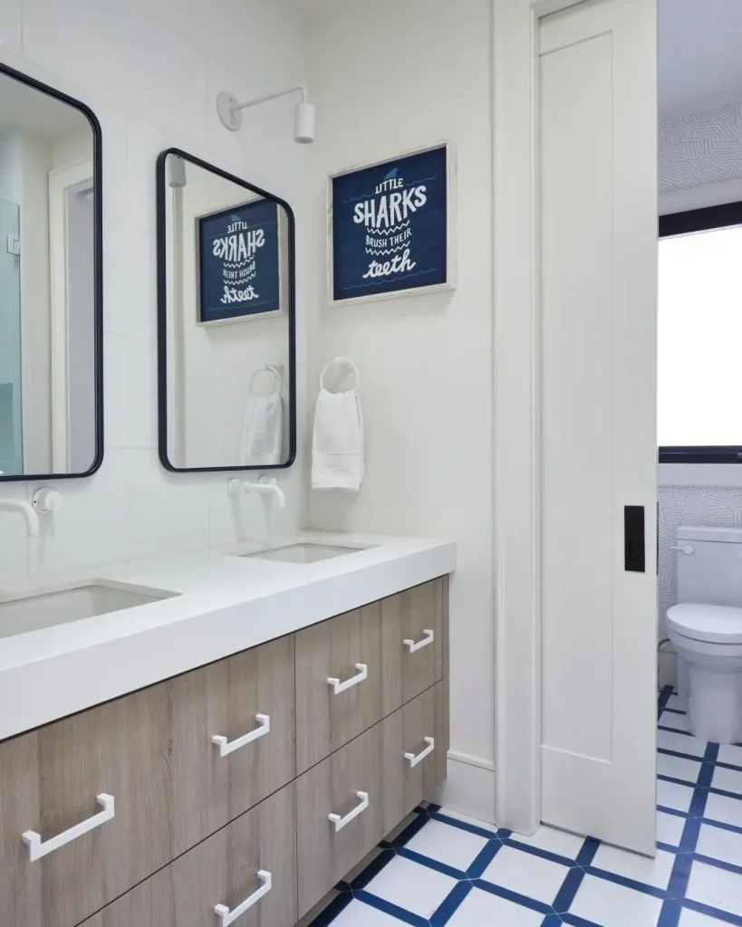کاشیهای آبی و سفید شبکهای، حس ساحل و موج میده. تابلو “کوسههای کوچولو مسواک میزنن” هم یک یادآوری بامزه است که شاید بالاخره مسواک زدن را تبدیل به بازی کند.