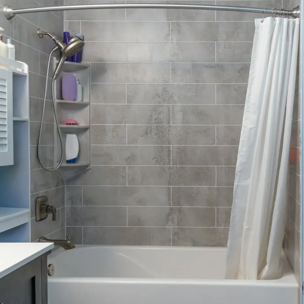 کاشی طوسی حس شهری و مدرن میدهد، ولی طراحیاش برای بچهها هم خوب است: میلهی پردهی خمیده کمک میکند داخل وان/دوش بازتر حس شود و آب کمتر بیرون بپاشد. قفسهی گوشهای توکار هم یعنی شامپوها و وسایل پخش نمیشوند.