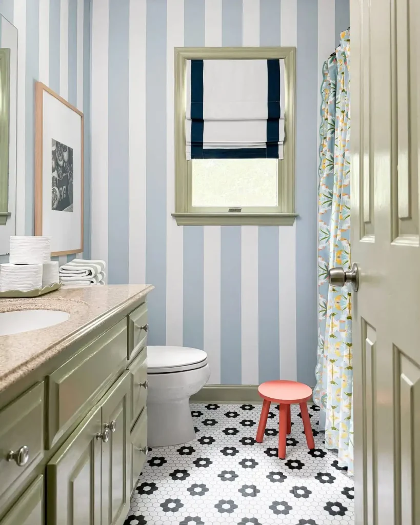 دیوارهای راهراه آبنباتی و کفپوش گلگلیِ رترو، این حمام رو شبیه یک قصهی تصویری میکنه. کابینت زیتونی هم حس “قدیمیِ شیک” میده؛ انگار یک وسیلهی خوشگل از خونهی مامانبزرگ پیدا کردی ولی امروزی چیدیش.