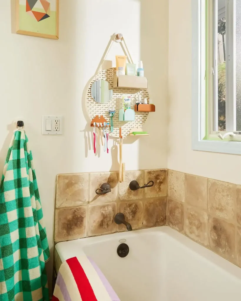 اینجا جذابیتش فقط رنگ نیست، هوشمندیاشه. حولههای رنگارنگ، کاشیهای خاکی، و یک نظمدهندهی آویز که حتی آینهی کوچیک هم داره، کاری میکنه حتی نگهداری مسواک هم “یه حرکت طراحی” حساب بشه.