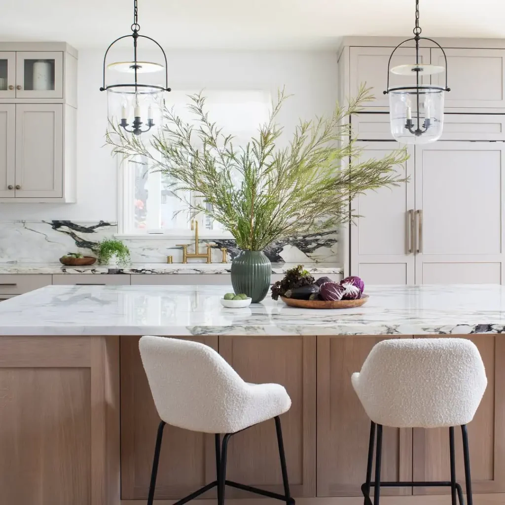 ترکیب چوب گرم، مرمر با رگههای نمایشی و شیشه شفاف، فضا را لایهدار و دعوتکننده میکند. از آن انتخابهایی است که آشپزخانه را واقعاً «قلب خانه» نشان میدهد؛ مناسب صبحانه، گپهای شبانه و همه چیز بین این دو.