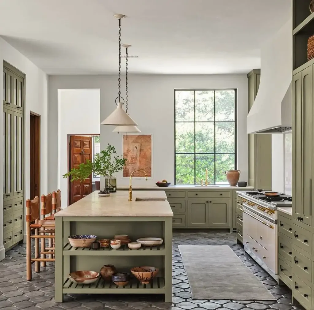 این فضا آرام و لوکس است، بیادعا. کابینتهای سبز مریمگلی ملایم، رنگهای گچی و کرمی، و پنجره بزرگ که نور طبیعی را میریزد داخل… حس یک ویلای اروپاییِ راحت را میدهد، بدون ادا.
