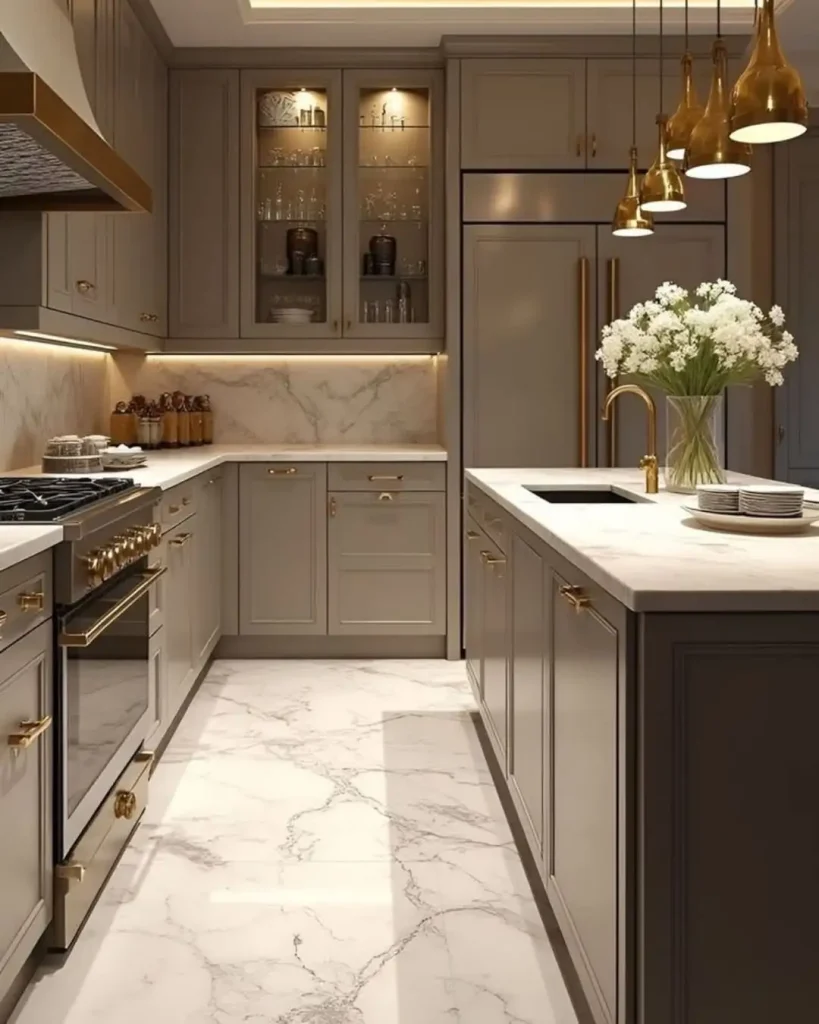 این آشپزخانه یک ظرافت عصرانه دارد. کابینت تاپی، کف مرمر، و نور مخفی زیر کابینت که همه چیز را کمی نرمتر و گرمتر میکند. چراغهای طلایی هم مثل زیورآلاتِ فضا هستند.