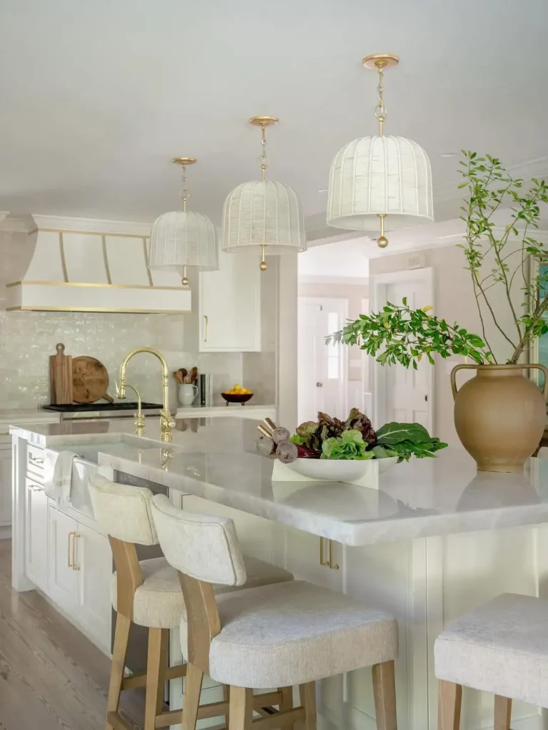 این چراغهای آویز حصیری/بافتدار، خیلی راحت و بیزحمت توجه را میگیرند. بالای جزیرهی مرمر کرمی با جزئیات برنجی، یک بافت نرم و دوستداشتنی میآورند که فضا را قابلنزدیک شدن میکند.