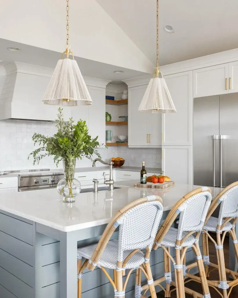 چهارپایههای حصیری، پالت سرد را گرم میکنند. حس یک خانه ساحلی را دارد که کلیشهها را کنار گذاشته و به جای آن سراغ خطوط مرتب و بافتهای فکرشده رفته. روشن، سبک و مناسب صبحانههای طولانی.