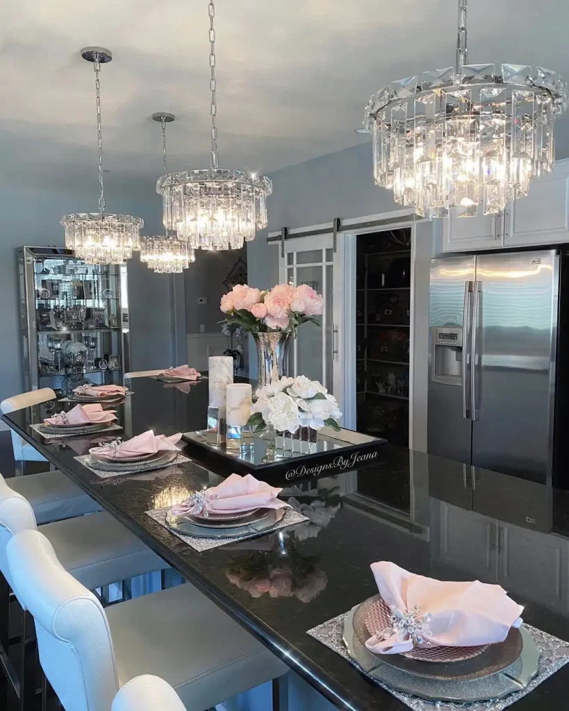 اگر قرار است فضا پر زرقوبرق باشد، این یکی تمامقد آمده. لوسترهای کریستالی بدون تعارف جسورند و با این حال خوب جواب دادهاند. کنار میز مشکی براق و چیدمان مرتب غذاخوری، درخشش کریستال «هدفمند» دیده میشود، نه اغراقآمیز.