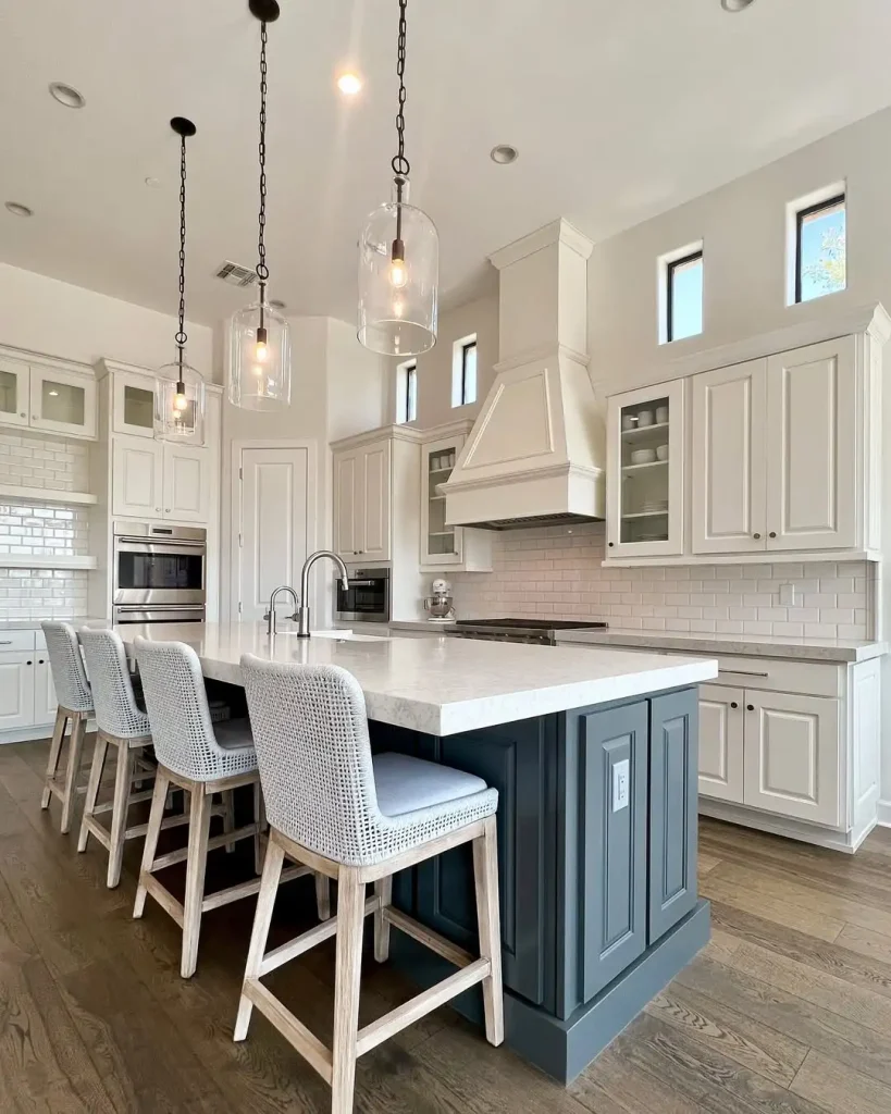 کابینت سفید تا سقف بلند رفته و حس شکوه آرام میدهد. بعد جزیرهی آبی تیره میآید و همه چیز را محکم و هدفمند زمینگیر میکند. چراغهای شیشهای با زنجیر یا پایه تیره هم کمی حس صنعتی میدهند، اما لطافت فضا را نمیدزدند.